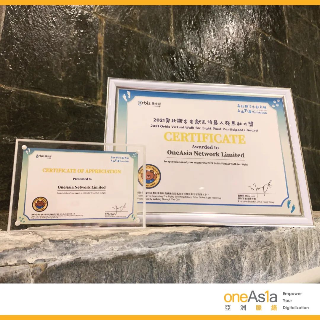 OneAsia 很荣幸成为2021年奥比斯「步步献光明」上山下海虚拟步行筹款活动企业赞助商之一。我们的团队合共完成了 30 多万步,并完成了户外拍照任务,OneAsia 更获颁“最人强马壮大奖”!感谢奥比斯,我们承诺继续支持奥比斯提供预防失明和复明治疗。